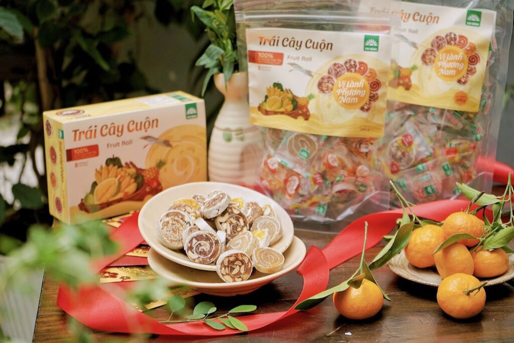 Trái cây cuộn (xoài, khóm…) | Trái cây chín, bánh phồng | Dẻo, ít ngọt, giòn của lớp bánh phồng bên ngoài, dễ mang theo | Châu Âu, Nhật, Việt Nam |