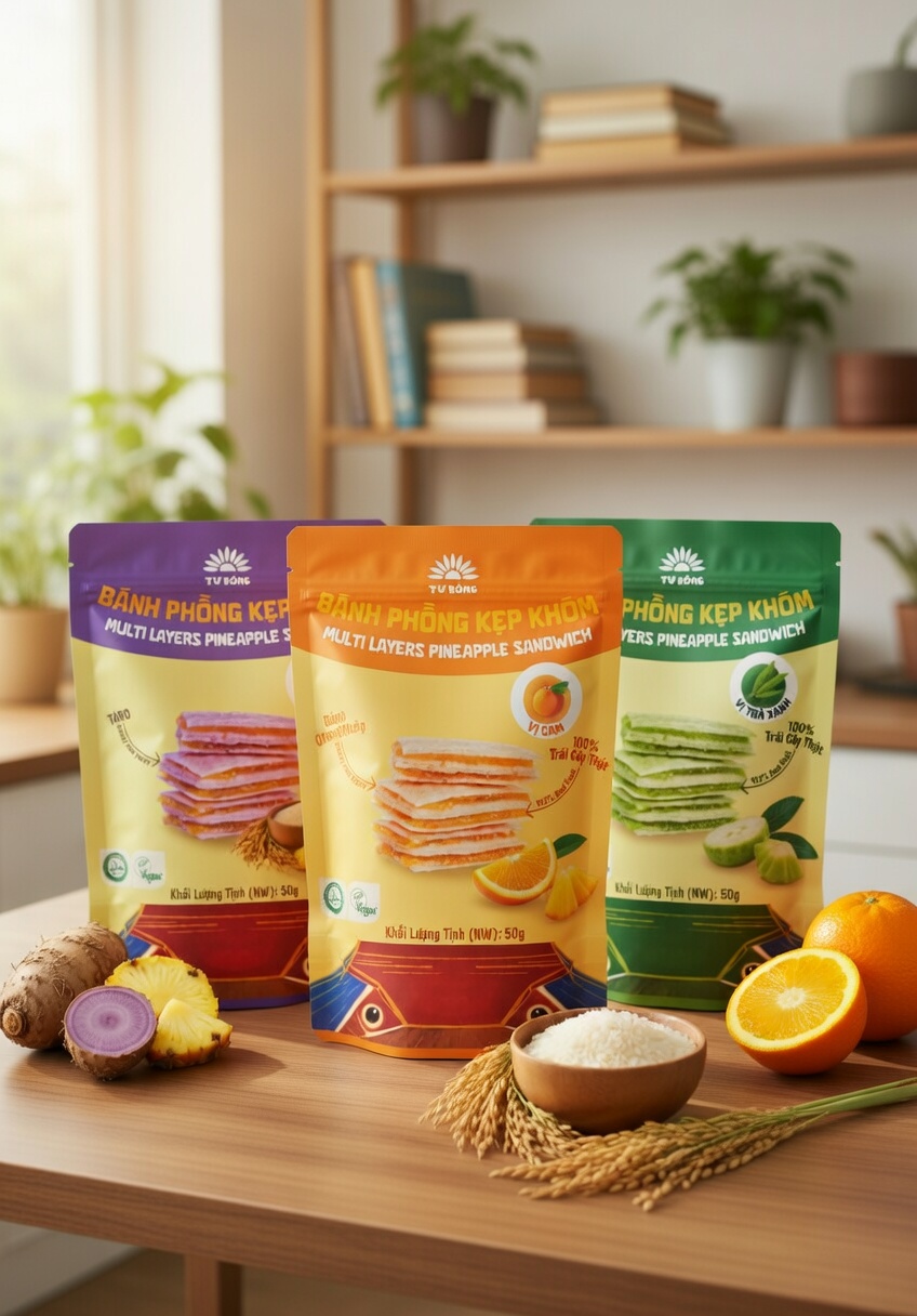 This concept offers a modern interpretation of traditional Vietnamese ingredients, transforming them into a convenient, ready-to-eat snack with strong visual appeal and market differentiation.