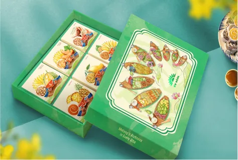 Khi đặt sản phẩm Tây Cát trong hộp quà Tết in logo, món quà trở nên sang trọng hơn. Dù là bánh chuối, hạt sen hay mứt trái cây, tất cả đều được nâng tầm nhờ thiết kế đồng bộ và tinh tế.