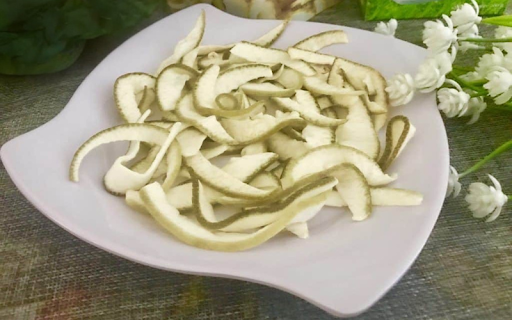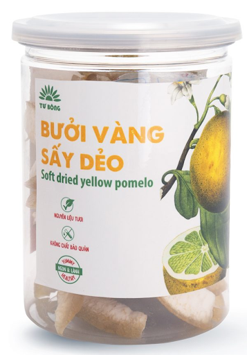 Khác với những loại trái cây sấy quen thuộc như xoài, mít hay chuối, vỏ bưởi sấy sử dụng phần vỏ – vốn thường bị bỏ đi – để chế biến thành món ăn vặt độc đáo. Sau khi sơ chế và sấy lạnh, từng miếng vỏ bưởi giữ được màu xanh nhạt hoặc vàng ngà, tỏa ra mùi thơm dịu nhẹ của tinh dầu bưởi.